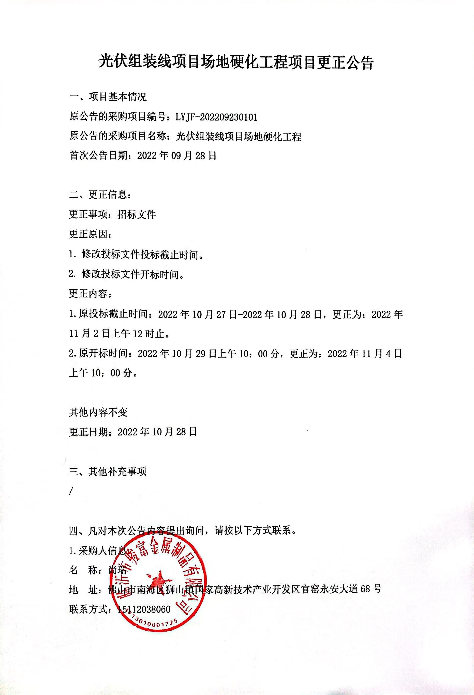 光伏組裝線項目場地硬化工程項目更正公告